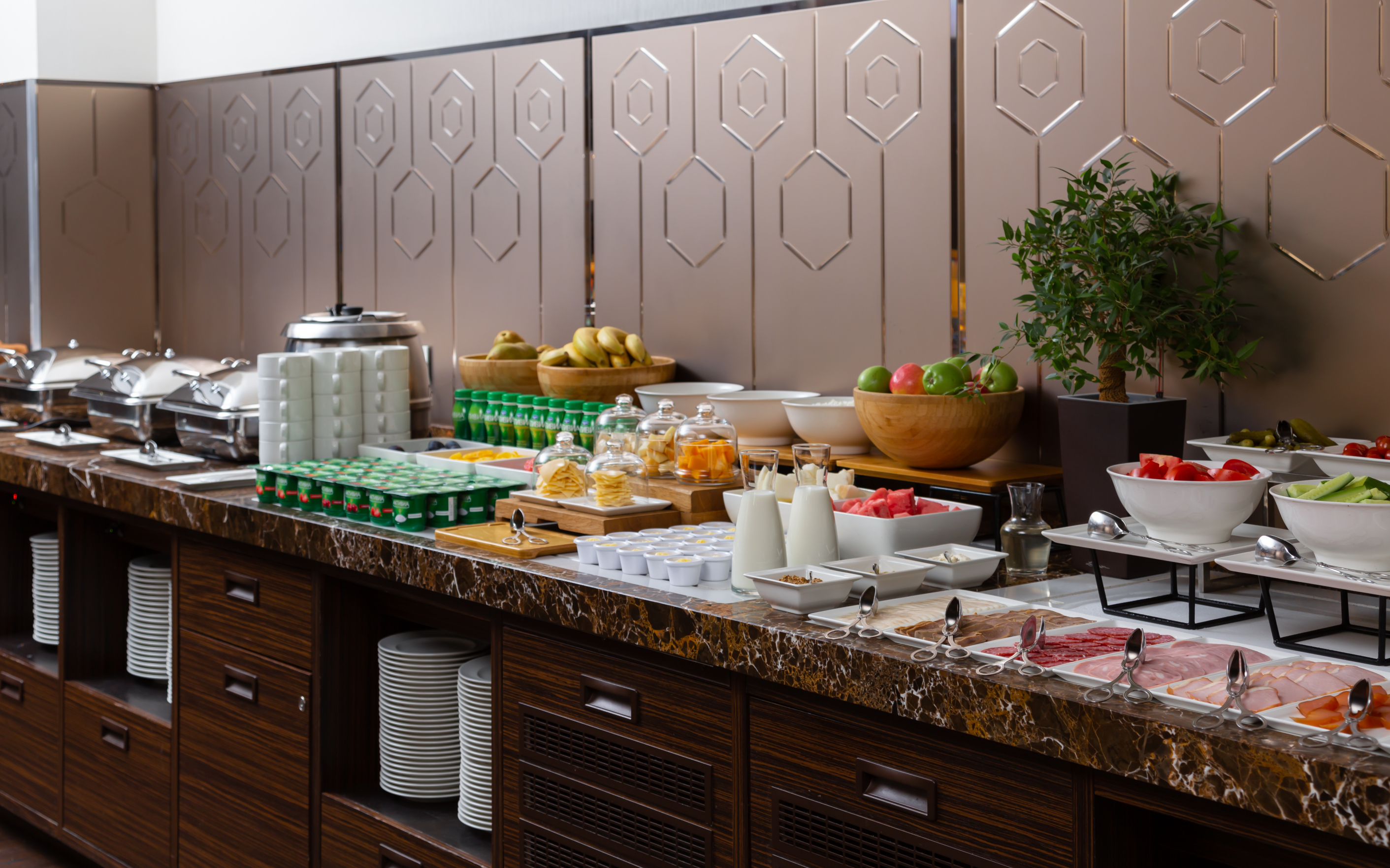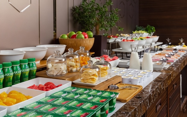 Guests can relax with a glass of wine and delicious food at the Overture Cafe-Bar, which serves Russian, Mediterranean, Lebanese and Asian cuisine. The 10Ten terrace bar serves mouth―watering dishes and fine drinks. Guests can enjoy coffee and snacks at the 24-hour lobby bar.